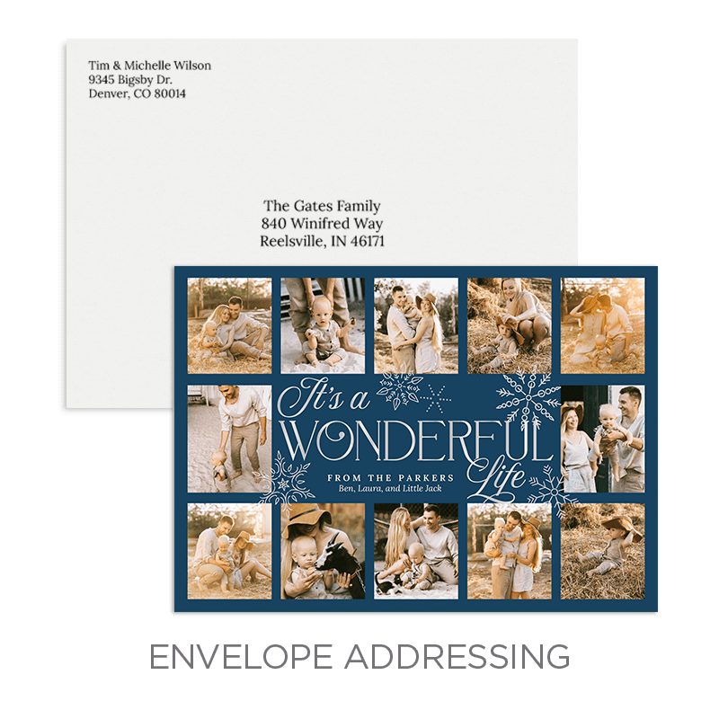 This stunning holiday photo card features twelve photo boxes to showcase your favorite memories, paired with the heartwarming message "It's a Wonderful Life" elegantly embossed in foil. It's a charming way to celebrate the season and share joy with loved ones. Personalize your message and select from a range of card-back option to enhance your card with additional pictures.