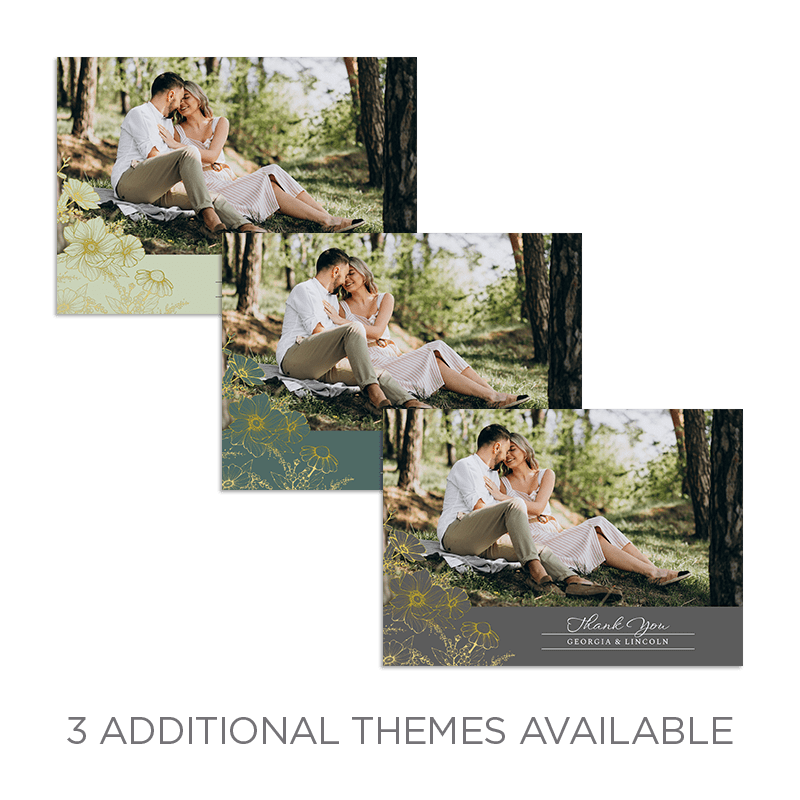 Add a delicate and romantic touch to your special day with this Thank You card in the Elegant Floral wedding suite. This design offers customization with one photo, multiple lines of custom text, and a color palette that fits your special day perfectly. This card is printed on a luxurious, soft touch laminate with raised foil elements to create a shimmering message of gratitude for family and friends. Choose from several card back options to add more photos and thank you notes. Coordinates seamlessly with the Elegant Floral Save The Date, Wedding Invitation, and Wedding Program.