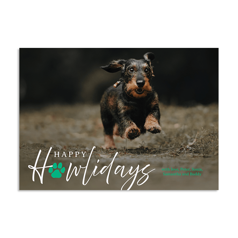 A playful holiday photo card with the message "Happy Howlidays," perfect for celebrating with your furry family. The design features a full-bleed photo of your pet, making them the star of your festive greetings. Add a personalized message and choose from several card-back options to add more pictures.