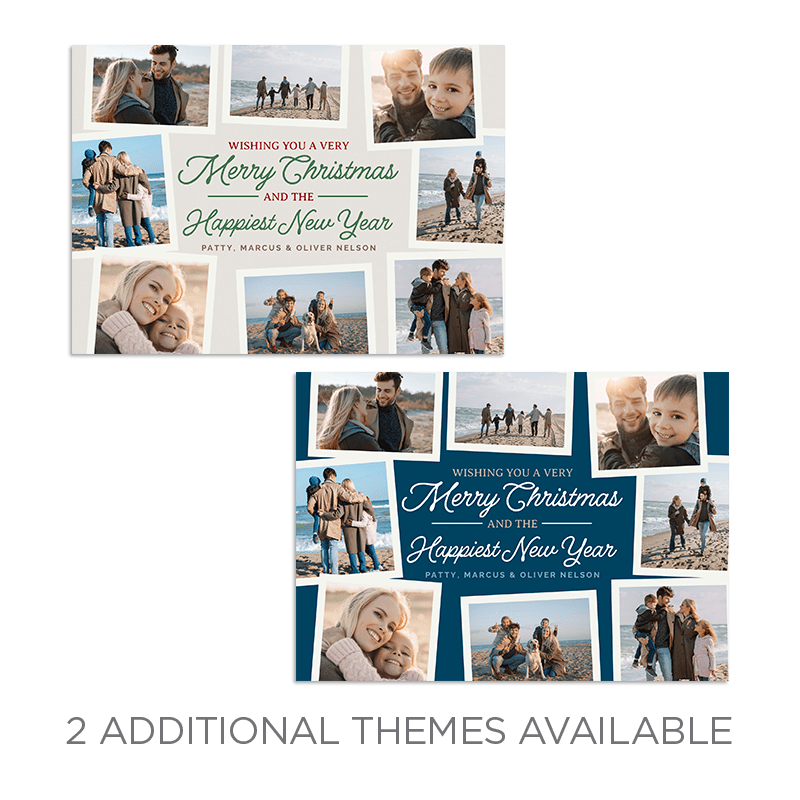 Send warm holiday wishes with our Merry Christmas and Happiest New Year card, featuring eight photo boxes highlighting your favorite moments. Choose from a variety of card-back options to include extra pictures and heartfelt holiday wishes.