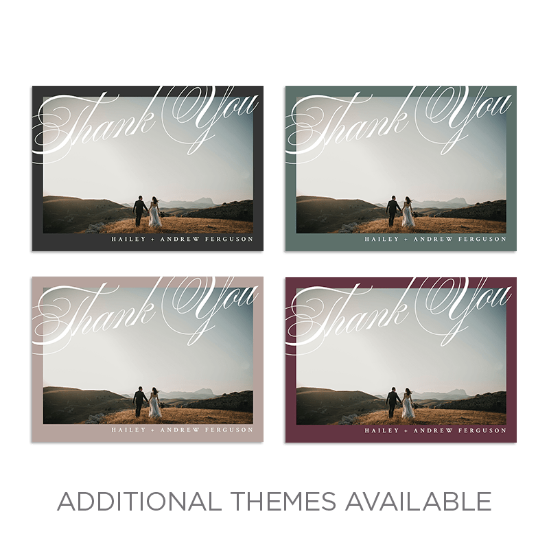Share your gratitude with this classical and stylish Modern Script Thank You card. Features full text customization and multiple card back design options to choose from. Also available: coordinating Modern Script Save the Date and Wedding Invitation cards.