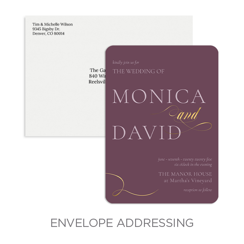 Elegant foil lines surround the Monica Wedding Invitation making it the perfect stationery to share your wedding announcement. This card is printed on a luxurious, soft touch laminate with raised foil elements to create a shimmering invitation for family and friends. Choose from several card back options to add more photos and wedding details.