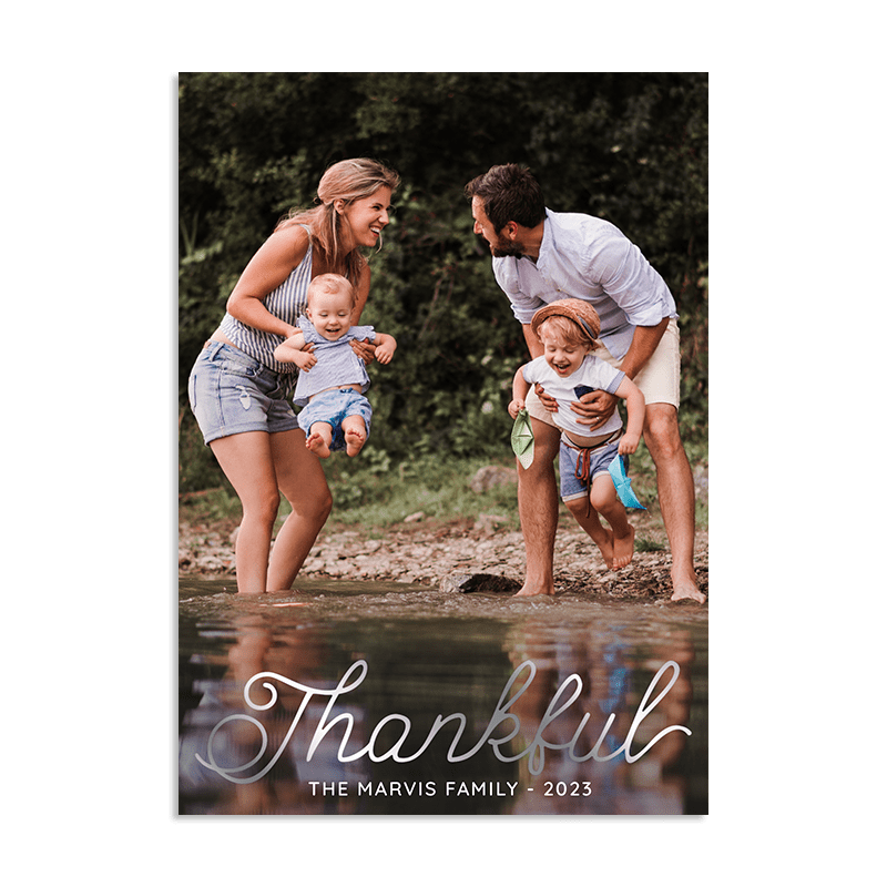 Give thanks for your blessings with the Thankful holiday card featuring a single photo. Personalize your card by adding family names, a date, or a special greeting. This card is printed on a luxurious, soft touch laminate with raised foil elements to create a gleaming holiday greeting for family and friends. Choose from several card back options to add more photos and holiday wishes.