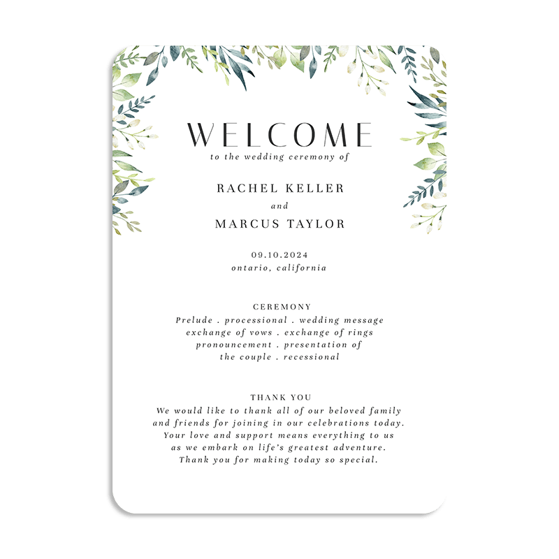 Share all the details of your wedding day with this playful and stylish Watercolor Floral Wedding Program. Features full text customization and multiple card back design options to choose from. Also available: Watercolor Floral Save the Date, Invitation, and Thank You cards.