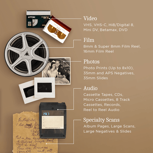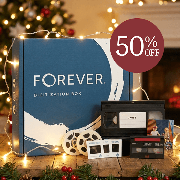 Makes a great holiday gift! Fill your Box with video tapes, photos, film reels, and other items. Ship them back to us and we'll digitize your memories and add them to your FOREVER Account, thumb drive, or DVD.