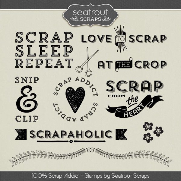 100% Scrap Addict Stamps by Seatrout Scraps ... 10 stamps that coordinate with the 100% Sceap Addict Collection. Also available as part of the discounted bundle. Keywords:- scrapbook, scrap, design, craft, photo, crop