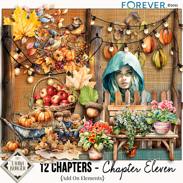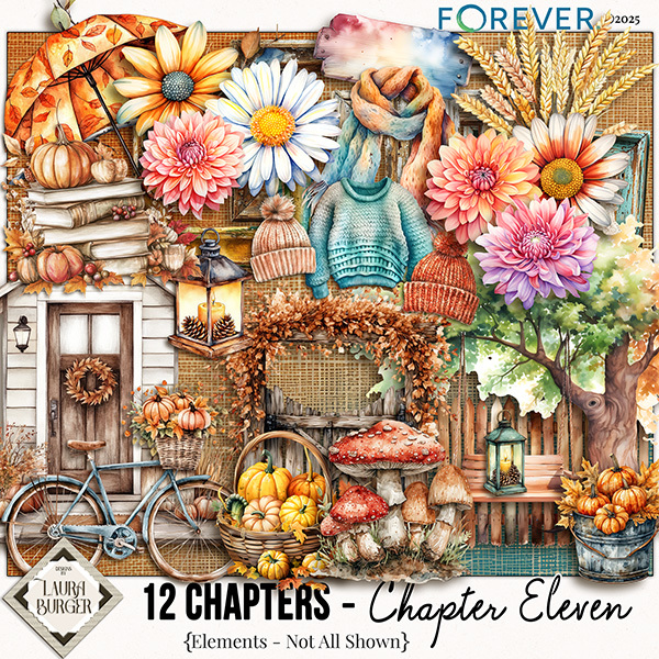 Your creative journey starts here."12 Chapters - Chapter Eleven" is the eleventh installment in a beautifully designed digital scrapbooking series. This product offers everything you need to craft stunning layouts and preserve your memories with style and creativity. Featuring a curated collection of digital papers, embellishments, and much more, Chapter Seven helps you tell your story with elegance and ease.This chapter introduces versatile elements inspired by timeless designs and modern aesthetics, perfect for beginners and seasoned scrapbookers alike. Use it to create unique digital scrapbooks, personalized photo albums, or thoughtful gifts.Start your 12-chapter journey, and let Chapter Eleven bring your memories to life!Keywords: Designs by Laura Burger, Laura Burger, creative journey, memories, mixed media, brown, tan, gold, aqua, teal. Orange, yellow, green, acorn, basket, apples, pumpkins, house, gate, sunflower, lamp, straw, hay, flowers, mushroom, tea, sign, scarf, books,, bike, blanket, chair, cocoa, hat, mittens, rake, sweater, enhanced digital art, forever digital art