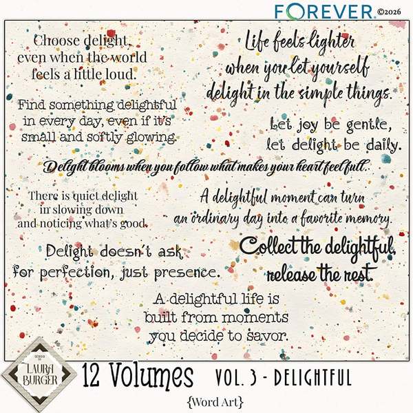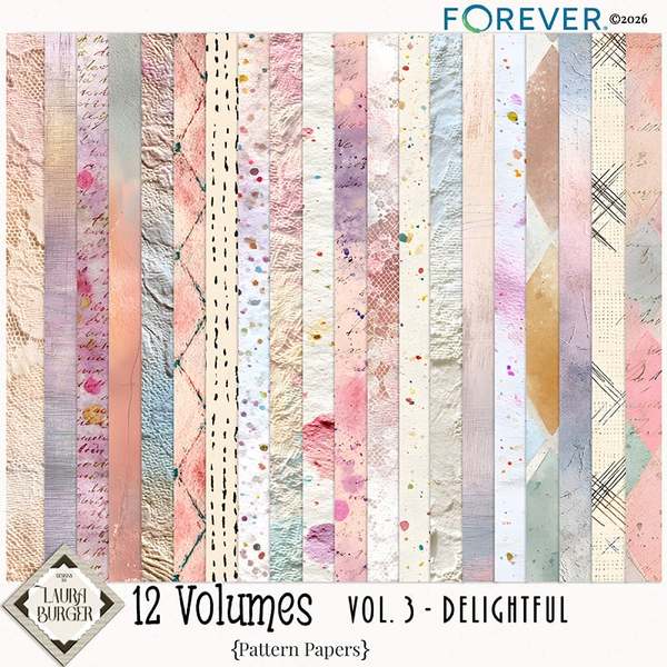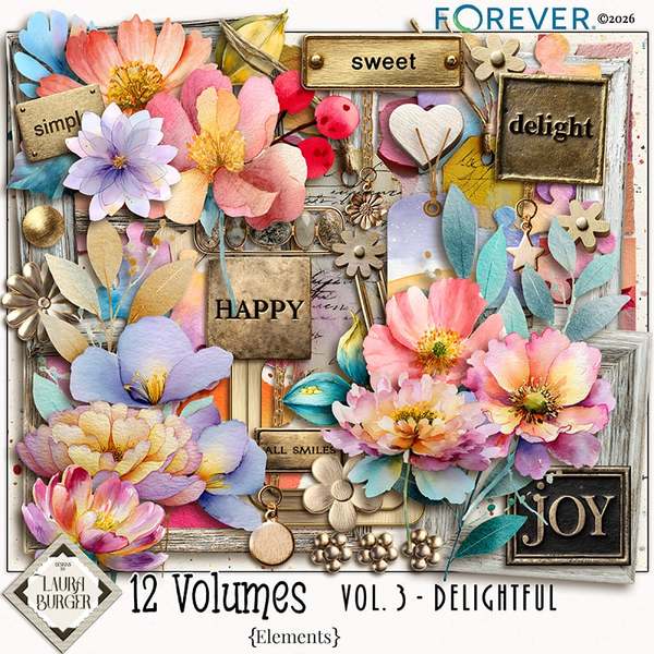 12 Volumes – Vol. 3 continues the story with layers of texture, meaningful details, and beautifully coordinated elements designed to help you document life exactly as it feels.This thoughtfully curated digital scrapbooking kit blends timeless papers, expressive embellishments, and versatile word art to help you tell stories that matter — from quiet everyday moments to milestone memories. Vol. 3 builds on the foundation of the series with depth, warmth, and artistic flexibility, making it perfect for layered layouts or beautifully simple pages.Inside you’ll find a harmonious mix of richly textured backgrounds, carefully designed elements, and storytelling accents that invite you to create pages filled with heart. Whether you're documenting family, everyday routines, seasonal reflections, or meaningful milestones, this volume gives you the tools to preserve your memories with intention.Designed for scrapbookers who love both structure and creative freedom, Vol. 3 works seamlessly as a standalone kit or paired with the other volumes in the series for expanded storytelling possibilities.Keywords: Designs by Laura Burger, Forever digital art, textured papers, spring summery colors, Paint and mask effects, pattern papers, wonderful word art, meaning sayings, gold tones, metal, vintage frames, watercolor flowers, flowing colors, pieces of wood accents, metal accents, metal words, charms, chain, clip, hearts, puzzle pieces, tags