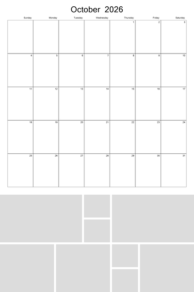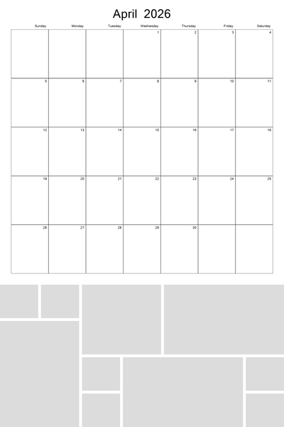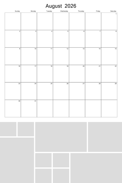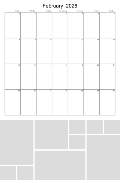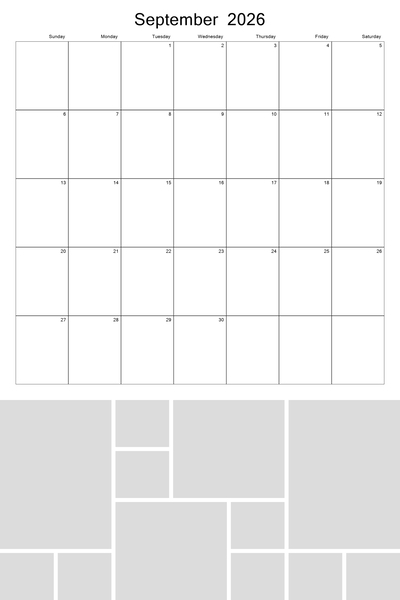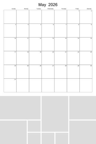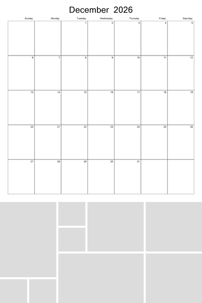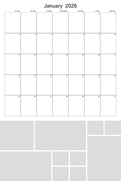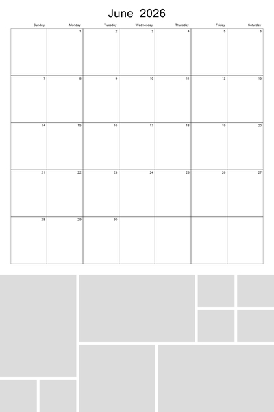 Create your 2026, 2027, 2028, 2029, and 2030 calendar with this customizable 12x18 perforated collage calendar template. With a big 12x12 calendar grid on the top, you'll be able to highlight your favorite photos in a collage grid at the bottom of each month. Better yet, 4 future years are pre-loaded into the template. Simply hide the current year when finished and then unhide the new year that you wish to use. This template can be used on both the 12x18 calendar as well as the 8x12 calendar. Designer: Roxanne Buchholz, Lucky Girl Creative