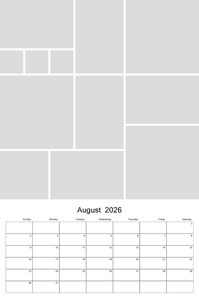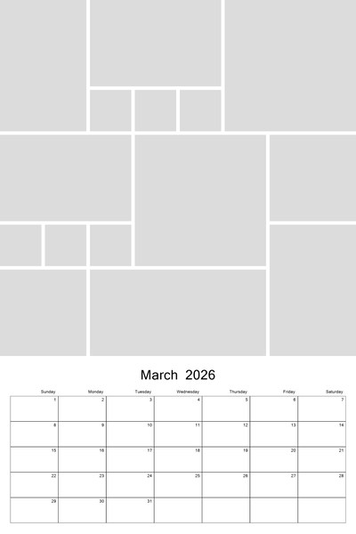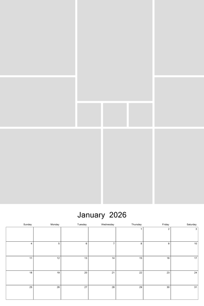 Create your 2026, 2027, 2028, 2029, or 2030 calendar with this customizable 12x18 collage calendar template. With a big 12x12 photo collage at the top, you'll be able to highlight your favorite photos of the month. Each calendar template page features a small calendar grid at bottom. This template can be used on both the 12x18 calendar or you can copy and paste the photo grid at top onto a 12x12 page project. Designer: Roxanne Buchholz, Lucky Girl Creative