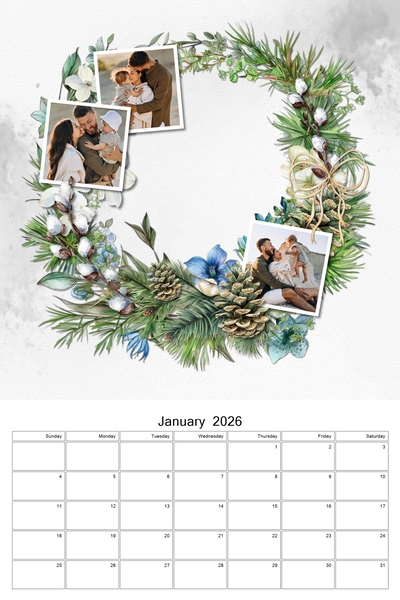 Create your 2026, 2027, 2028, 2029, and 2030 calendar with this customizable pre-designed watercolor wreath 12x18 perforated calendar template.