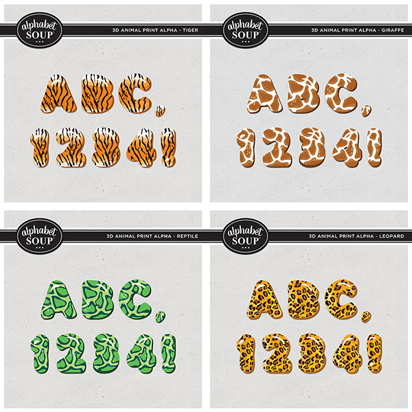 Add the perfect title or word art to your page with alphas by Alphabet Soup. This purchase is for the 3D Animal Print Alpha Bundle. It includes four unique alphas (each with A-Z, 0-9 and limited punctuation).