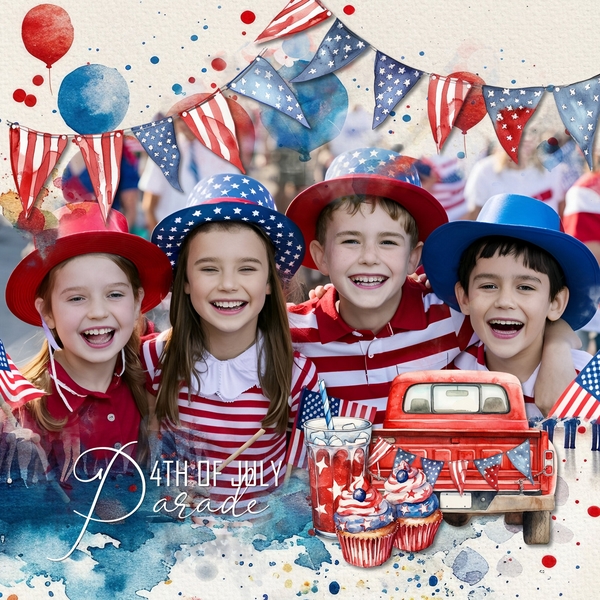 Accent your digital scrapbooking pages with these patriotic watercolor embellishments and papers that can be used for Independence Day, Fourth of July, USA, America, the United States of America, marching band, fireworks, and military parade pages, and more. Embellishments include American flag, balloon, barbeque grill, BBQ, bicycle, bike, bow tie, banner, bunting, pickup truck, stars, confetti, glitter, cupcake, donut, beer, drink, soda, eagle, firetruck, fire hydrant, fireworks, sparklers, hanging basket flowers, wagon, popsicle, watermelon, hat, hot air balloon, Liberty Bell, marching band, medal of honor, drum, trumpet, horn, music notes, airplane, Stealth, plane, car, auto, automobile, classic cars, motorcycle, tractor, paper fan, picnic table, dog, puppy, German Shepherd, Pit Bull, Golden Retriever, Yorkie, ribbon, bow, rocket, boat, sailboat, shop, store, main street, family, child, children, mom, dad, man, woman, soldier boy, street, sunglasses, Uncle Sam, wreath, and more. This kit includes the 4th of July Watercolor Parade Elements and the 4th of July Watercolor Parade Papers. This kit coordinates with the 4th of July Watercolor Bundle sold separately. Designer: Roxanne Buchholz, Lucky Girl Creative