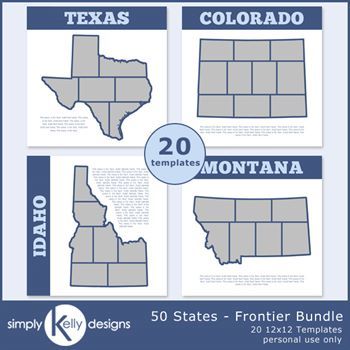 This bundle has 20 12x12 templates of Colorado, Idaho, Kansas, Montana, Nebraska, New Mexico, Oklahoma, Texas, Utah and Wyoming.
