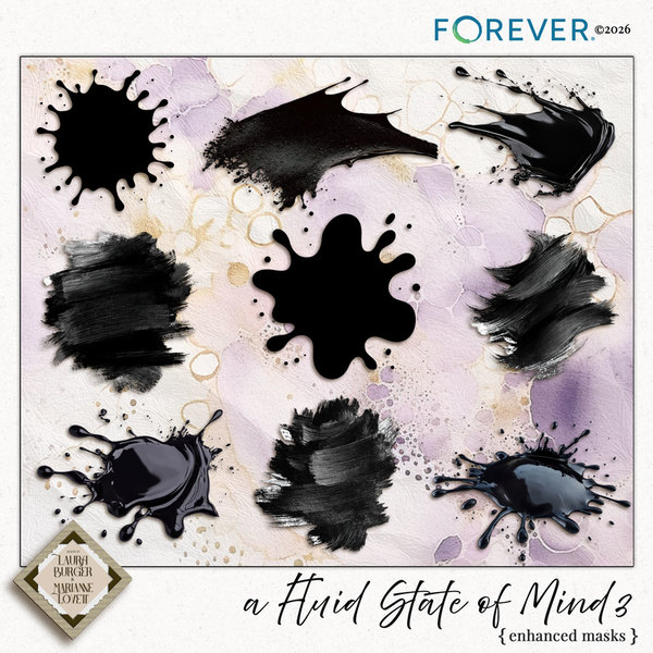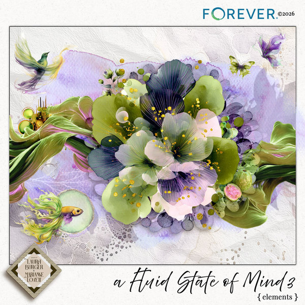 A Fluid State of Mind 3 continues the expressive, painterly journey of the beloved series with a fresh burst of luminous contrast and artistic depth. This bundle blends flowing florals, organic branches, layered transparencies, and fluid textures in a brighter, more energized palette of fresh greens, soft olives, glowing purples, gallery whites, and inky accents. Delicate gold details, airy movement, and painterly overlays add richness and dimension, while the included alphabet, enhanced masks, ribbons, banners, and expansive paper collections provide endless creative flexibility. Designed for expressive storytelling, artistic layouts, and modern memory keeping, A Fluid State of Mind 3 invites creativity to flow freely bold, balanced, and beautifully alive.KeywordsA Fluid State of Mind 3, fluid art, painterly florals, artistic scrapbook kit, modern digital scrapbooking, expressive design, alcohol ink style, organic elements, flowing branches, abstract overlays, transparent overlays, enhanced masks, artistic masks, fluid papers, watercolor textures, mixed media, luminous contrast, green and purple palette, olive green, soft violet, gallery white, gold accents, botanical elements, ribbons and banners, artistic alphabet, creative storytelling, modern memory keeping, layered textures, bird, bouquet, butterfly, circles, fish, fruit, ribbon, bubbles, flower, garland, leaf, wreath, Designs by Laura Burger, Marianne Lovett