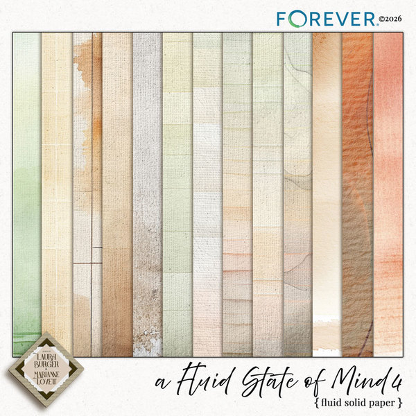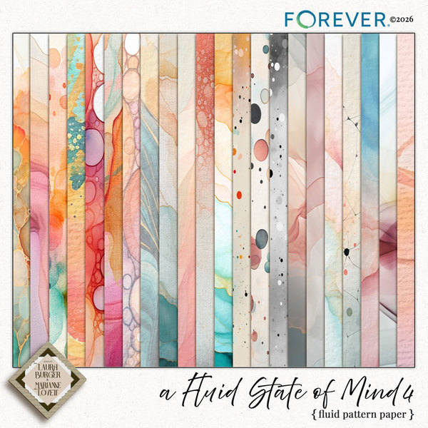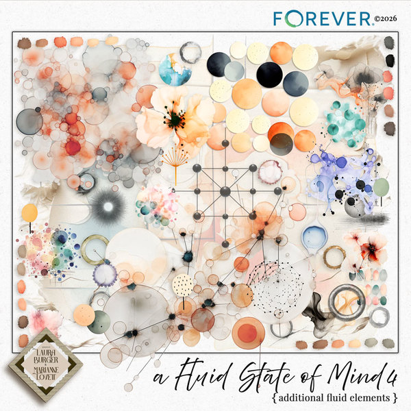 A Fluid State of Mind 4 marks a bold evolution in this beloved series, introducing a more modern, conceptual take on fluid design. While earlier volumes embraced soft florals and organic flow, this collection explores the intersection of fluid art and structure- where movement meets form.Blending watercolor washes with geometric elements, layered circles, fine lines, and abstract compositions, this kit offers a fresh, contemporary feel. Delicate florals are still present, now paired with modern accents for a balance of softness and sophistication.Featuring fluid elements, clusters, frames, overlays, masks, and richly textured papers, this versatile collection supports both clean, structured layouts and free-flowing artistic expression- perfect for memory keeping, art journaling, and creative storytelling.Keywords: Designs by Laura Burger, Marianne Lovett, fluid art scrapbook kit, abstract scrapbook kit, fluid paint elements, alcohol ink style, paint pour effect, watercolor blends, abstract florals, modern scrapbook kit, artistic scrapbook elements, mixed media scrapbook, abstract backgrounds, fluid textures, creative scrapbook kit, contemporary scrapbook design, geometric accents, circle elements, line elements, grid design, structured abstract, splash, splatter, ink marks, paint strokes, layered masks, photo masks, fluid overlays, gradient overlays, modern frames, artistic frames, layered clusters, dimensional embellishments, creative layouts, art journaling scrapbook, expressive design kit, colorful abstract papers, fluid pattern papers, fluid solid papers, modern memory keeping, unique scrapbook bundle, Forever scrapbook kit