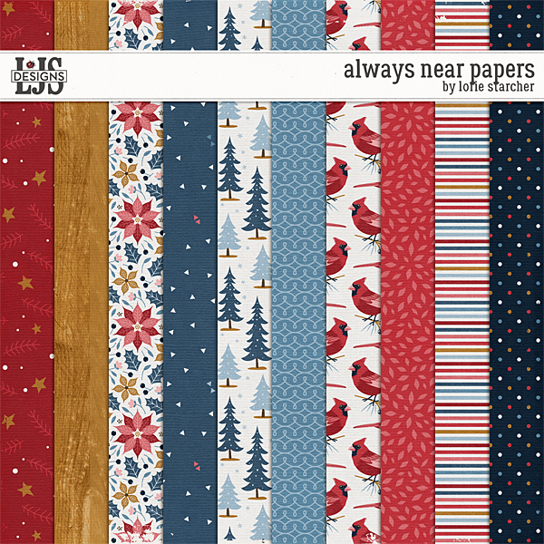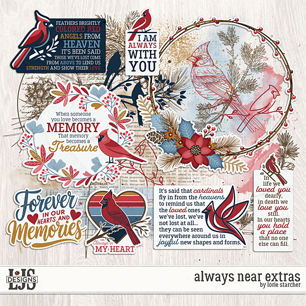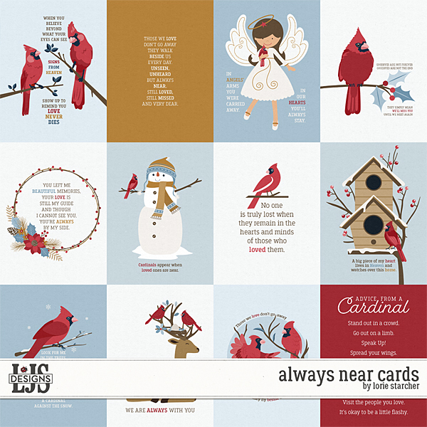 Always Near, based on the saying "Cardinals appear when Angels are near," by LJS Designs is memorial kit filled with wintery elements including cardinals, snowmen, deer and more. Use it to scrap the stories of loved ones that have passed on, yet remain in your heart and life through memories and an unwavering belief that love never dies. Buy the Bundle and get the kit and all the packs for a special price.