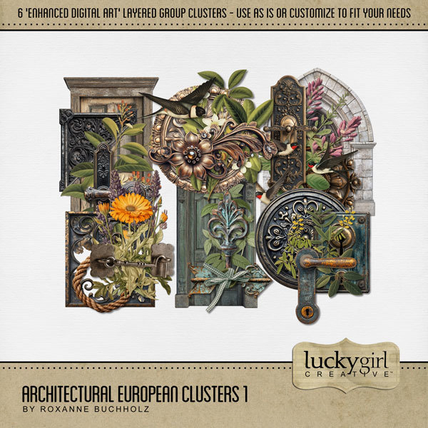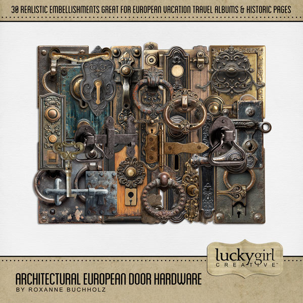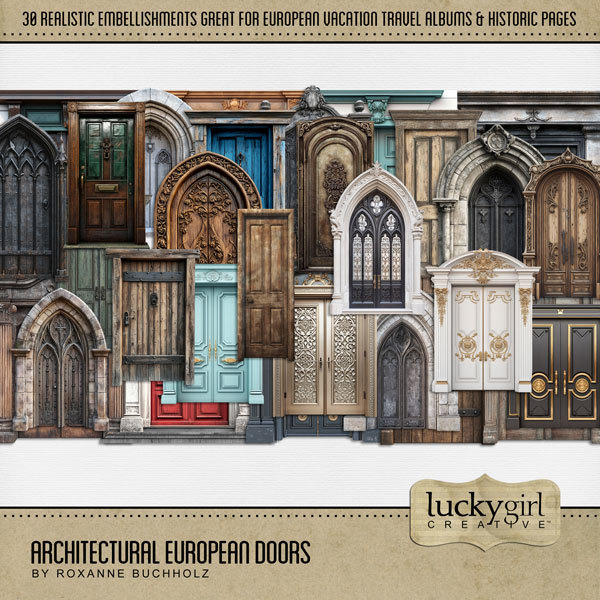 BRAND NEW for the The Pixie 500 Virtual Crop on Friday, April 17 - Sunday, April 19, 2026! Get ready to travel with these realistic embellishments from across Europe. Great for accenting your vacation and holiday pages as well as other historic sites throughout the world. This bundle includes Architectural European Clusters 1, Architectural European Door Hardware, Architectural European Door, Architectural European Metal Ornaments, and Architectural European Alpha Set 1. Designer: Roxanne Buchholz, Lucky Girl Creative