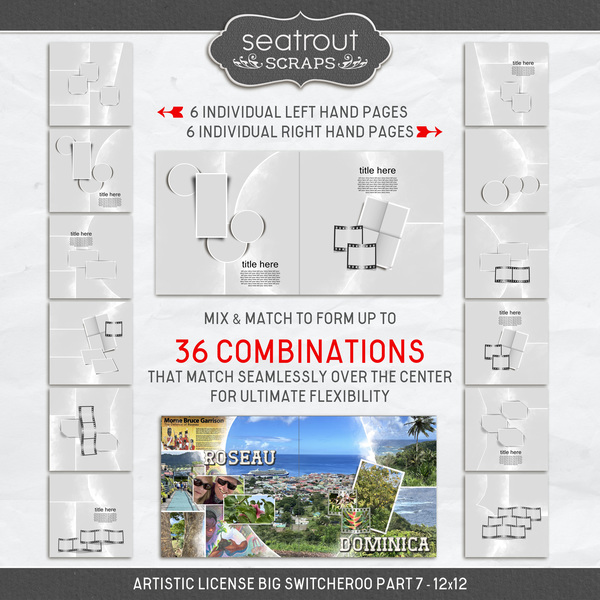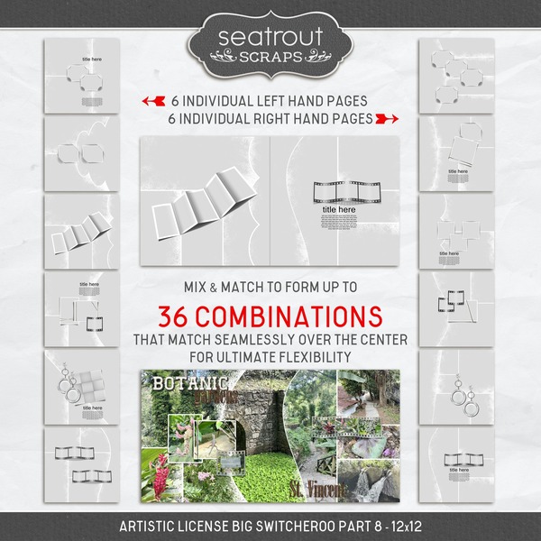 Parts 7,8 and 9 of Artistic License Big Switcheroo brought together in one cost effective bundle. Any left hand page can be combined with any right hand page from these collections offering you a total of 324 unique double page spread combinations. Add in some Artistic License Photo Spot Mania offerings and your possibilities are endless. To watch a video seeing these templates in action please visit https://l.forever.com/GDv6H_cz
