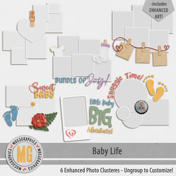 Baby Life Enhanced Photo Clusters - 10 Fingers, 10 Toes... Celebrate your sweet little one with this Baby Life Collection. Whether you are scrapping your childhood, your kids, or grandkids, you'll find plenty of baby items to complete your pages. This is the ENHANCED PHOTO CLUSTERS. Included are 6 large photo clusters that you can add from the Embellishments Tab and ungroup to customize. You can rearrange, resize, reorder, or recolor any layer in these clusters. Be sure to check out the rest of this series: The Bundle, Alphas, and Adoption Pack.