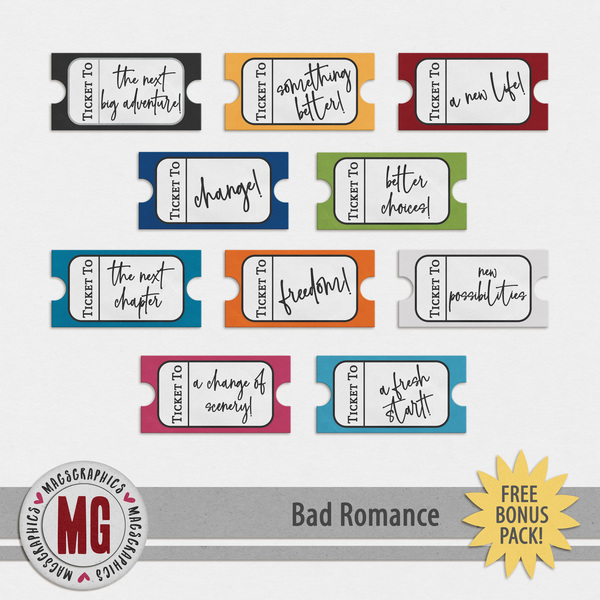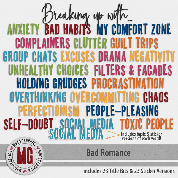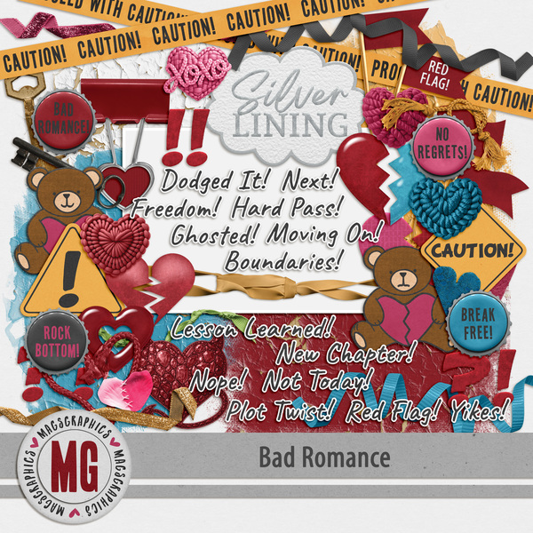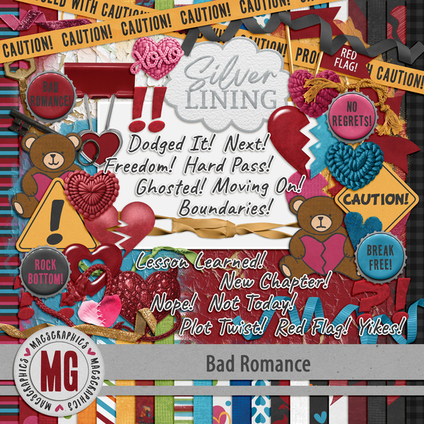 Bad Romance Bundle - It’s time to break up with the situations, habits, and patterns that haven’t brought you peace or growth. The BAD ROMANCE series celebrates letting go of what holds you back and choosing positivity, clarity, and new adventures. This collection is all about fresh starts, empowered choices, and rewriting your story with intention and joy. Save money with the BUNDLE! This Bundle contains over 160 items from the Main Kit, Edge Overlays, Sticker Titles, Word Art, and BONUS Tickets. All of the following are included: 22 12"x12" papers, 1 Enhanced photo cluster, 2 arrows, 2 bears, 4 blendables, 4 bottlecaps, 2 caution signs, 2 caution tapes, 1 clip, 1 cloud, 3 broken hearts, 1 devilish heart, 8 hearts, 2 keys, 3 punctuation marks, 4 red flags, 5 ribbons, 2 strings, 14 stickers, 23 titles and 23 stickered versions of those titles, 9 edge overlays, 16 word art.