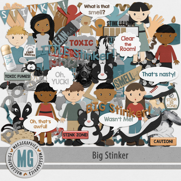 Big Stinker Bundle - If you have teenagers, pets, or anyone who plays sports living in your home, then you are familiar with BAD SMELLS. This BIG STINKER Collection is for scrapping REAL LIFE... the good, the bad, and the smelly! Get everything plus a bonus with this BUNDLE! The Big Stinker Bundle includes 25 Papers, 72 Elements, 1 Alpha, 12 Smokey Fumes, 12 Titles, and 2 BONUS Enhanced Frame Clusters. The complete element list includes: 2 arrows, 2 babies, 1 banner, 1 bucket, 6 callouts, 1 candle, 2 cleaners, 2 clouds, 1 deodorant, 3 feet, 2 flies, 2 gas clouds, 1 gas mask, 1 glove, 1 gym shoe, 8 kids, 1 knot, 1 laundry basket, 1 loading bar, 4 noise words, 2 people icons, 1 poop emoji, 3 ribbons, 2 ricrac, 3 signs, 4 skunks, 2 sponges, 4 sprays, 3 flourishes, 2 titles, 3 trash elements, 26 Uppercase Letters, 26 Lowercase Letters, 10 Numbers, 32 Symbols, 12 fume elements, 12 titles (3 Enhanced), & 2 BONUS Enhanced Photo Cluster Frames.