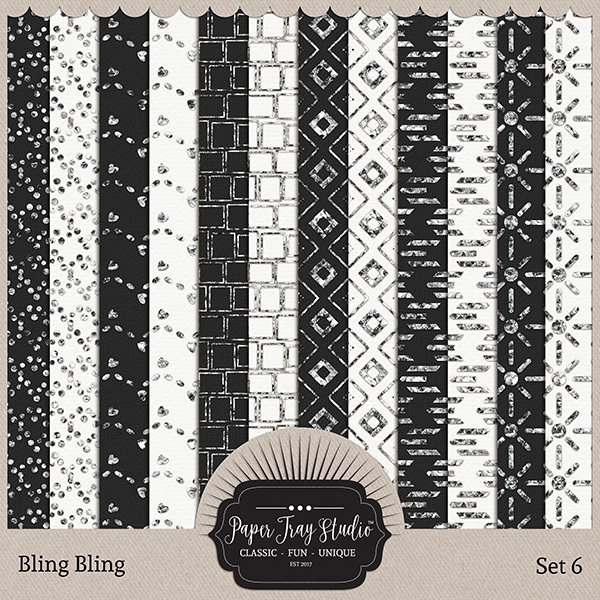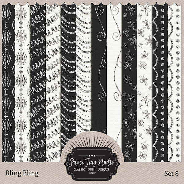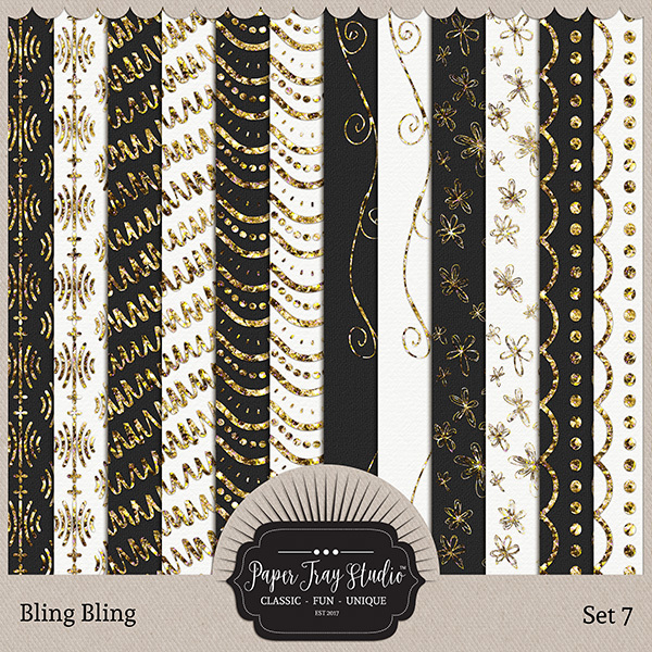 Bling Bling Sets 5-8 by Paper Tray Studio. Get your sparkle on with this fun collection that positively shines. Dripping with fun glitter in silver and gold, each set includes 12 papers. This purchase is for Bling Bling - sets 5-8. It includes 48 papers.