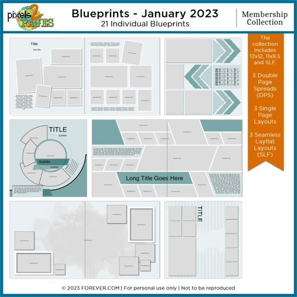 This installment of pixels2Pages monthly membership Blueprints include nine unique Blueprint (BP) designs in 12x12 and 11x8.5 sizes. In addition, we are including our Double Page Spread BPs (DPS) as a Seamless Layflat (SLF) file. You will receive 21 individual Blueprints to use for easily creating layouts that preserve your memories.