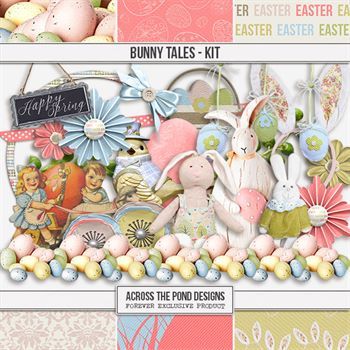 Bunny Tales - Discounted Bundle by Across The Pond Designs Includes the entire Bunny Tales collection: page kit, alpha, edgers, clusters, burlap papers, pre-designed page and word art