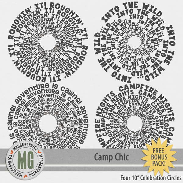 Camp Chic Bundle - Forget roughing it! This Camp Chic Collection lets you scrap your CAMPING or GLAMPING adventures - from tents to campers to the swankiest of RVs. You find everything you need in this massive series! This is the Camp Chic BUNDLE, and it is PACKED with items! You'll find 24 Papers, 78 Elements, 1 alpha, 10 gnomes, 14 titles, and 4 BONUS celebration circles. The complete item list includes: 24 12"x12" papers, 1 ax, 3 backpacks, 1 pair binoculars, 1 set of boot prints, 1 bug spray, 1 cabin, 1 camera, 2 campers, 1 canteen, 2 cars, 3 carabiners, 1 chair, 2 clips, 1 compass, 2 coolers, 2 campfires, 1 flashlight beam, 2 flashlights, 3 flowers, 2 GPS devices, 1 bit of grass, 1 helmet, 1 journal, 1 kayak, 1 lantern, 1 set of string lights, 1 log, 1 map, 1 mosquito, 6 mountains, 1 mug, 2 pine sprigs, 1 pot, 1 rope, 1 RV, 3 signs, 2 sleeping bags, 1 s'more, 2 suitcases, 3 tents, 1 thermos, 2 trees, 2 word arts, 1 walking sticks, 7 wood tags, 10 gnomes, 14 word art / titles, and 4 BONUS Celebration Circles. Note - the Enhanced Photo Clusters and Deluxe Layflat Papers are sold separately.