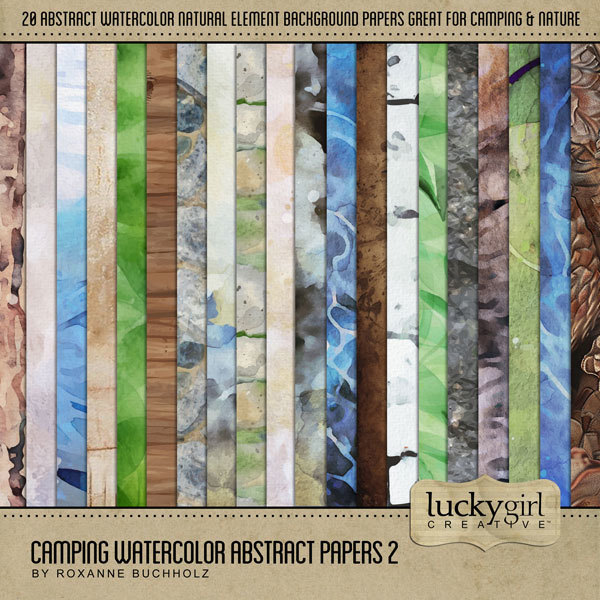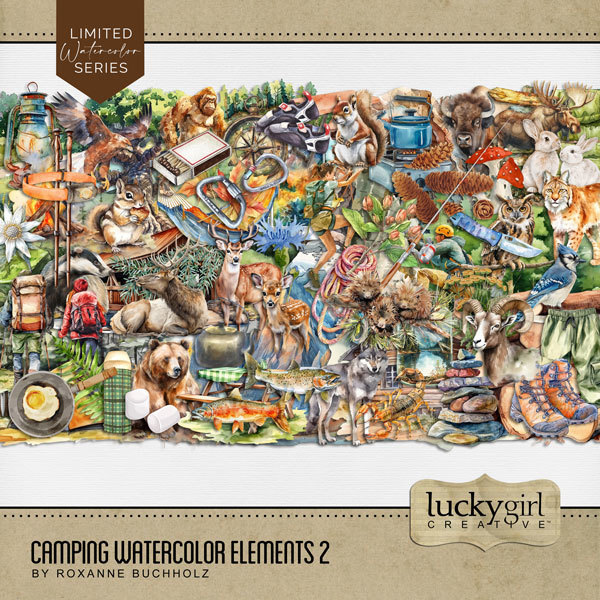 Travel and explore the outdoors and nature with your favorite watercolor camping supplies, hiking and climbing gear, fishing tackle, flora and fauna, and wildlife included in this bundle containing embellishments, papers, an alpha set, and enhanced digital art grouped clusters. Embellishments include animals, badger, bear, Big Foot, Sasquatch, bird, hawk, eagle, owl, buffalo, bison, bunny rabbit, squirrel, fox, deer, stag, elk, fish, trout, salmon, horse, lynx, moose, porcupine, puppy dog, Husky, scorpion, sheep, ram, chipmunk, wolf, adventure backpack, camp stove, candle, cave, camping chair, table, climbing gear, carabiner, chalk bag, climbing shoes, rope, blue jeans, denim, shorts, pants, rain jacket, leaves, leaf, fern, compass, covered bridge, fishing bucket, fishing net, fishing pole, fishing vest, flowers, wildflowers, Edelweiss, marshmallows, fry pan, grass, hammock, headlamp, hiker man, hiker woman, hiking stick, kettle, teapot, knife, scenery, landscape, lake, mountain, river, stream, waterfall, path, trail, lantern, cabin, cottage, log cabin, lure, matches, picnic table, pinecones, river raft, sleeping bags, rocks, boulders, stones, tent, thermos, tin cup, mushrooms, towel, tree, wood pile, logs, wooden directional sign, campground sign, and wood slats. This bundle includes Camping Watercolor Abstract Papers 2, Camping Watercolor Clusters 2, Camping Watercolor Elements 2, Watercolor Vintage Landscape Papers, and Dirt Crumble Alpha Set. Designer: Roxanne Buchholz, Lucky Girl Creative