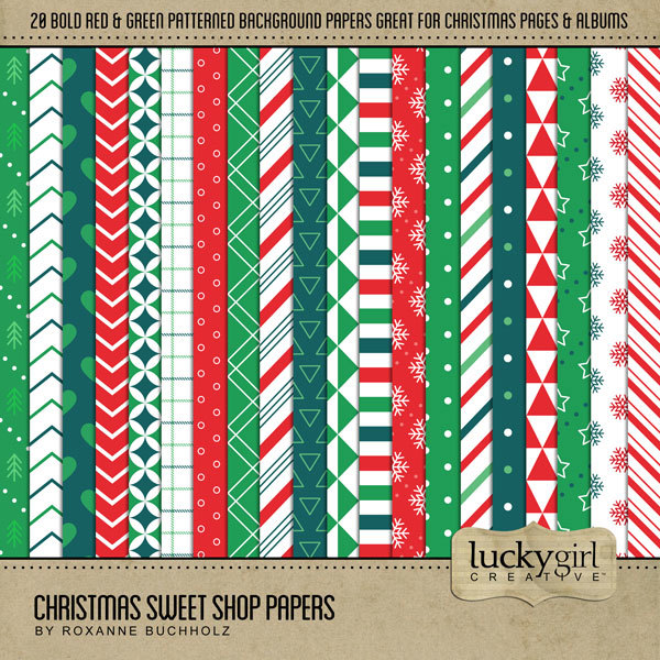 Add these sweet embellishments and bold patterned papers to all your holiday digital scrapbooking pages! In hues of red, green, and white, these sweet elements add so much fun to all your Christmas projects including greeting cards and holiday decor. Embellishments include cake pop, cake, candy cane, candy cane frames, heart, candy corn, gingerbread house, cookie, star, Christmas tree, cupcake, elf, penguin, Santa Claus, snowflake, wreath, donut, doughnut, frosting, icing, peppermint, ribbon, candy, hard candy, holly, poinsettia, chocolate covered pretzel, ribbon, bow, chocolate, sprinkles, sucker, lollipop, and more. This kit is included in the Christmas Sweet Shop Bundle and includes the Christmas Sweet Shop Elements and Christmas Sweet Shop Papers. Designer: Roxanne Buchholz, Lucky Girl Creative