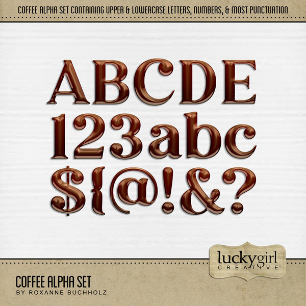 Cozy up your page titles with these tasty coffee-inspired alpha sets! Great for coffee shops, time with girlfriends, morning coffee, and more! Each of the 5 java alpha sets consist of a full set of uppercase letters, lowercase letters, numbers, and most punctuation. The bundle contains Coffee Alpha Set, Coffee & Cream Alpha Set, Coffee Grinds Alpha Set, Coffee Shop Alpha Set, and Latte Alpha Set. Designer: Roxanne Buchholz, Lucky Girl Creative