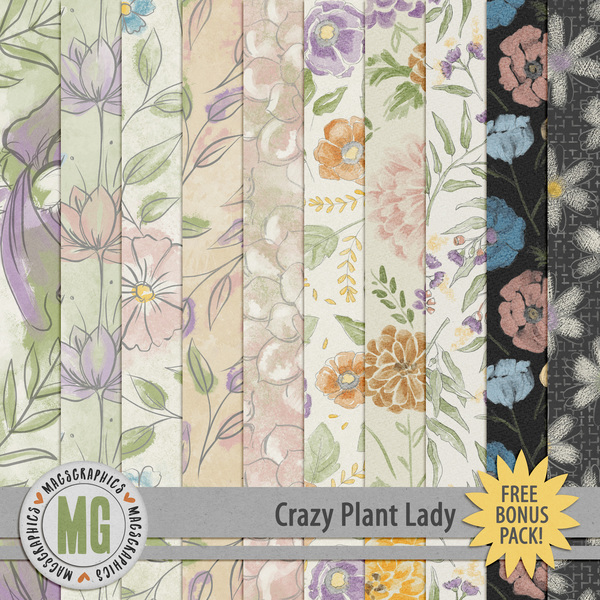 Crazy Plant Lady Bundle - Calling all plant lovers… and plant strugglers! Whether your home is a lush jungle of thriving greenery or a rotating cast of “what went wrong this time,” the Crazy Plant Lady Collection is here for it all. Filled with gorgeous papers, leafy elements, and a healthy dose of humor, this collection lets you document your plant wins, your plant fails, and every overwatered, underwatered, and “I swear it was fine yesterday” moment in between. This is the Main BUNDLE. It contains the MAIN KIT, GNOMES, MASKS & MASK EFFECTS, ENHANCED TITLES, and BONUS set of Grunge Floral Papers. All of the following are included: 30 12" Papers, 100 Elements (1 bee, 1 berry sprig, 1 bird, 4 buds, 1 butterfly, 5 cactuses, 2 clippers, 1 fence, 3 flowers, 1 garden, 2 gloves, 1 hoe, 6 hodge podge, 4 labels, 1 ladybug, 7 leaves, 8 potted plants, 3 rakes, 5 seed packets, 1 shovel, 12 signs, 1 soil bag, 3 succulents, 1 sun, 2 green thumbs, 1 trowel, 1 watering can, 1 wheelbarrow, 20 Word Tags), 10 Gnomes, 6 Masks, 6 Mask Effects, 6 Enhanced Titles, and 10 BONUS 12" Grunge Papers. Note - the Alphas and Enhanced Photo Clusters are sold separately.