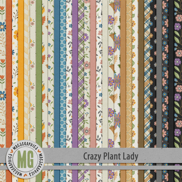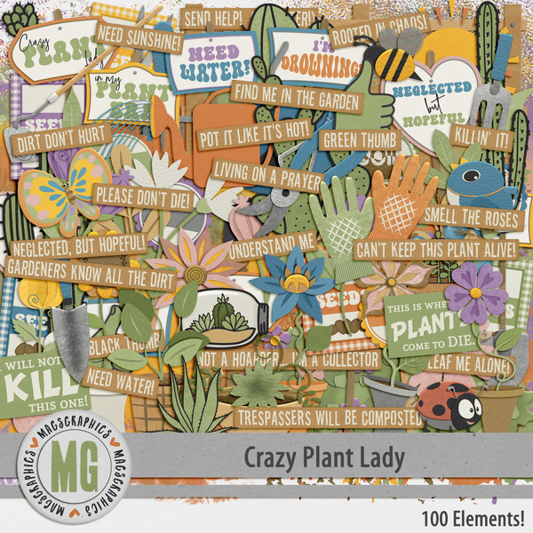 Crazy Plant Lady Kit - Calling all plant lovers… and plant strugglers! Whether your home is a lush jungle of thriving greenery or a rotating cast of “what went wrong this time,” the Crazy Plant Lady Collection is here for it all. Filled with gorgeous papers, leafy elements, and a healthy dose of humor, this collection lets you document your plant wins, your plant fails, and every overwatered, underwatered, and “I swear it was fine yesterday” moment in between. This is the MAIN KIT. It includes 30 12" Papers and 100 Elements! All of the following embellishments are included: 1 bee, 1 berry sprig, 1 bird, 4 buds, 1 butterfly, 5 cactuses, 2 clippers, 1 fence, 3 flowers, 1 garden, 2 gloves, 1 hoe, 6 hodge podge, 4 labels, 1 ladybug, 7 leaves, 8 potted plants, 3 rakes, 5 seed packets, 1 shovel, 12 signs, 1 soil bag, 3 succulents, 1 sun, 2 green thumbs, 1 trowel, 1 watering can, 1 wheelbarrow, 20 Word Tags. This pack is also included in the Crazy Plant Lady Bundle.