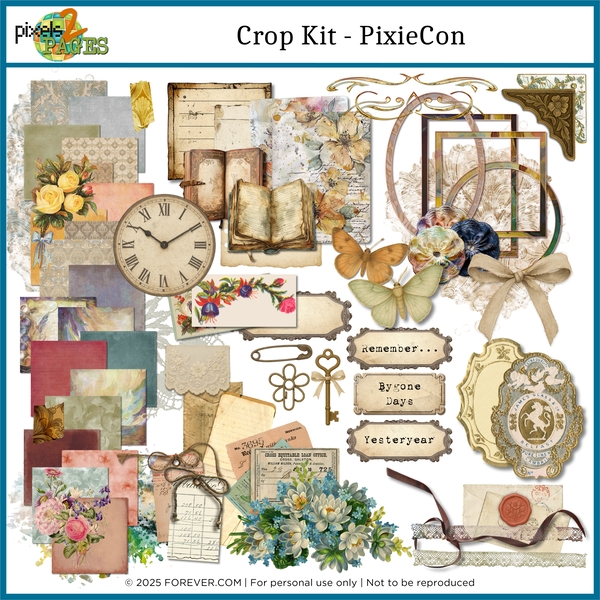 Step into the whimsical world of Pixie Con with this richly layered crop kit, brimming with vintage charm and imaginative flair. This collection features an array of textured and designed papers in dusky pastels, warm neutrals, and dreamlike marbled hues. Coordinating embellishments include antique books, ornate frames, floral clusters, retro tags, ribbons, lace, and labels—perfect for crafting story-rich pages with a nostalgic twist. Handwritten notes, vintage ephemera, and delicate doilies add layers of history and warmth, while painterly blooms and intricate overlays offer a touch of fantasy. Whether you’re documenting heirloom memories or creating enchanting layouts, this kit gives you all the tools to craft something truly timeless.