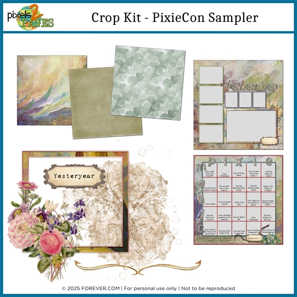 Get a taste of the Crop Kit - Pixie Con with this curated sampler kit. Featuring a small selection of the full kit’s artistic papers, themed frames, floral embellishments, and journaling cards. The sampler also includes a pre-designed layout to inspire your creativity. With warm neutrals, soft greens, and ethereal backgrounds, this sampler offers a glimpse into the storytelling and the design potential of the full kit.