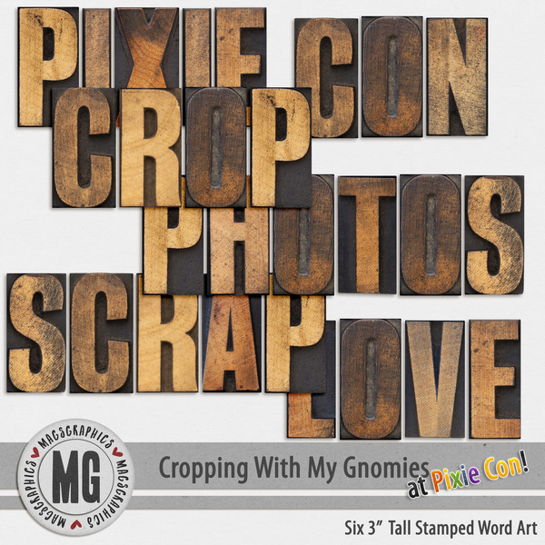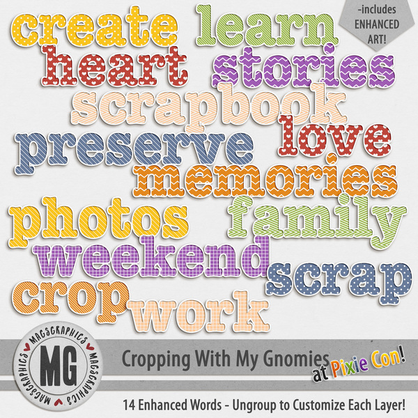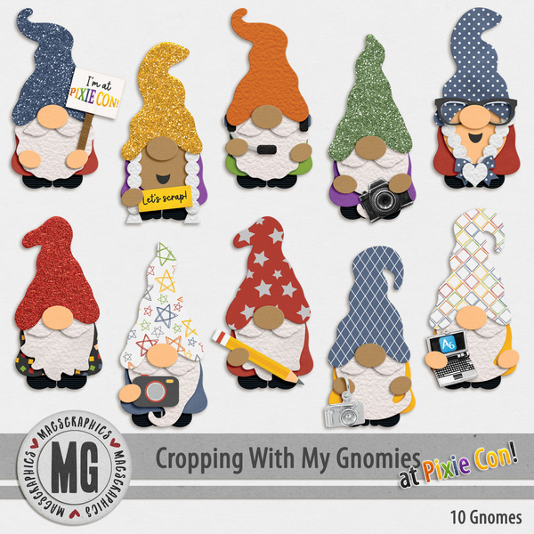 Cropping With My Gnomies at Pixie Con - The Gnomes are back and headed to PIXIE CON! This Bundle complements the original Cropping With My Gnomies packs and Enhanced Photo Clusters. Expand your stash and scrap your weekend crop adventures! This Bundle includes NEW Content: 6 11" Enhanced Photo Clusters you can ungroup to customize along with 14 Enhanced Words; ungroup and customize the color or pattern color. You'll also find 10 gnomes, 6 3"-high stamped Word Art, and 3 long Titles. Mix and match with the rest of the Cropping With my Gnomies series!