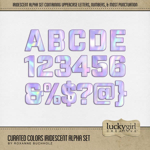 Collect the new 'Curated Colors' series and have all your colors curated in easy-to-find coordinated color bundles. Add these iridescent and holographic embellishments, textured and wood papers, alpha set, and everyday wire word art to all your digital scrapbooking pages and mix-and-match them on various projects throughout the year! Iridescent embellishments include angel wings, bird, dolphin, octopus, seahorse, unicorn, whale, puppy dog, balloon, wedding bell, glass bottle, ribbon, bow, bowtie, bubble, baseball cap, hat, clothes, fabric. clock, robe, dress, gown, shirt, shoes, high heel, sweatshirt, hoodie, cloud, coffee maker, crown, disc, CD, DVD, fairy, pixie, firework, sparkles, flower, leaf, tropical, rose, gem, crystal, rock, gift box, present, happy face, butterfly, dragonfly, key, lightbulb, lightning bolt, luggage, suitcase, magic wand, magnifying glass, megaphone, mushroom, boom box, radio, cassette tape, music, musical not, disco ball, headphones, ornament, paint splash, planet, Saturn, plastic flower, purse, bag, rainbow, rocket ship, seashell, pearl, clover, shamrock, skull, snowflake, snowman, star, moon, statue, tag, toy, dragon, teddy bear, space saucer ship, woman, and globe. This bundle contains Curated Colors Iridescent Elements, Curated Colors Iridescent Kit, Curated Colors Iridescent Alpha Set, Curated Colors Iridescent Papers, Curated Colors Iridescent Wood Papers, and Curated Colors Word Art 17. Designer: Roxanne Buchholz, Lucky Girl Creative