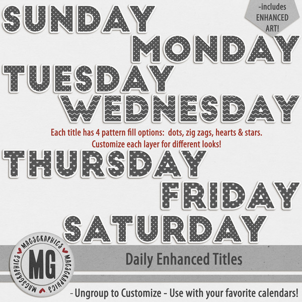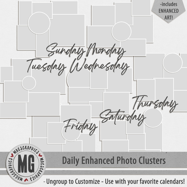 Daily Enhanced Photo Clusters & Titles - Love creating Day-To-Day Albums? Use this set of 7 Daily Enhanced Photo Clusters and Daily Enhanced Titles! Add these from the Embellishments Tab; then ungroup and adjust as needed. Use the cursive title provided, or swap it out for one of the block, layered titles. Each photo cluster has 7 photo spots so you can remove the title and use these for 1 layout per week. Each title has 7 layers: background, color, choice of 4 patterns, and beveled edge. Choose the pattern you want to use and hide the others. You can recolor any layer by changing it to sepia and then changing the hue/saturation. Or fill with a layer with color or paper. You'll be able to create many different looks and use these again & again! This product has a VIDEO showing it in action.