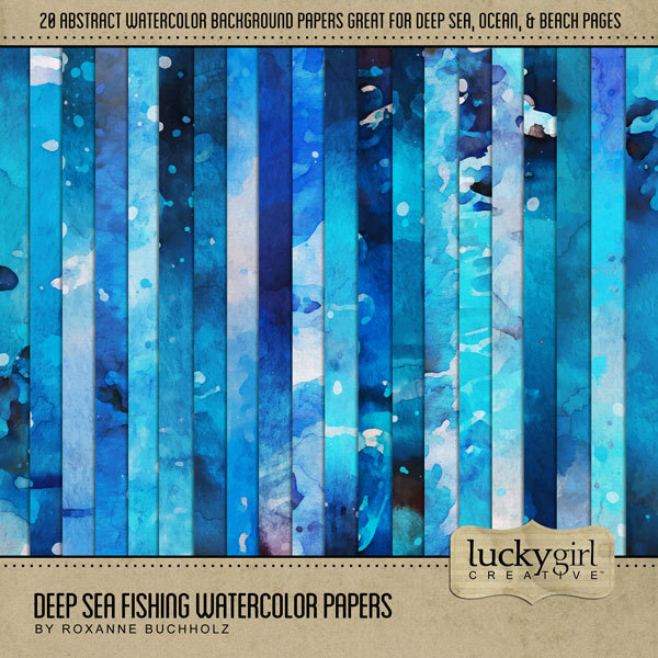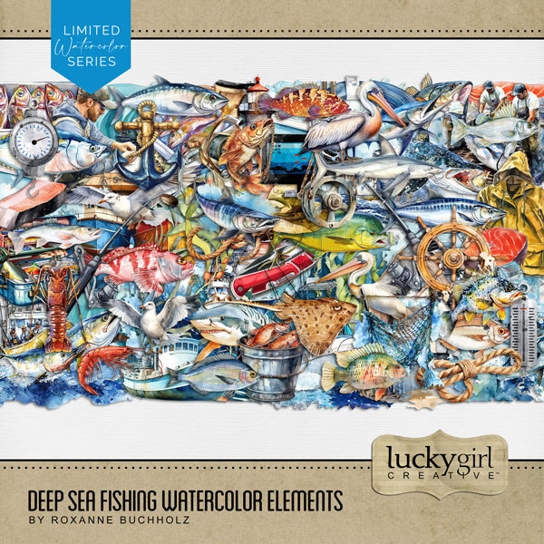 These watercolor embellishments and abstract water papers are the perfect addition to any summer fishing trip, ocean adventure with friends, or saltwater offshore fishing digital scrapbooking pages. Perfect for vacations to Florida, California, the Caribbean, Hawaii, and more. Embellishments include pelican, bird, seagull, fish, lobster, shark, shrimp, bucket of fish, hat, rain jacket, cooler, insulated bag, ice, pier, dock, rope, wharf, depth finder, fish on ice, angler, fishing boat, waves, fishing hook, net, fishing pole, reel, tackle box, raw fish fillets, knife, life preserver, lighthouse, lure maker, anchor, nautical gear, rope, ship wheel, pulley, seaweed, weight, scale, and more. Fish include tuna, sailfish, blue marlin, wahoo, grouper, red snapper, amberjack, bass, dorado, wahoo, swordfish, mahi mahi, sardine, chum, bait, flounder, rock fish, mackerel, skate, barracuda, and more! This kit includes the Deep Sea Fishing Watercolor Elements Kit and the Deep Sea Fishing Watercolor Papers, also sold separately. Designer: Roxanne Buchholz, Lucky Girl Creative