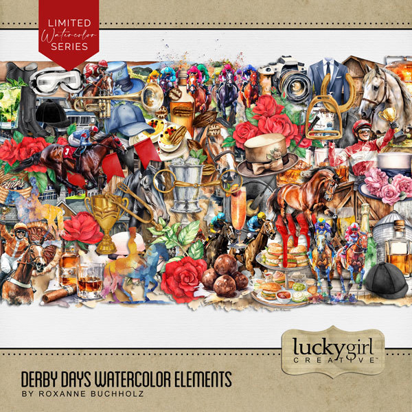 Celebrate all things Kentucky, equestrian, horse racing, and bourbon with this beautiful watercolor Derby Days embellishments and papers kit. Great for horse racing, bourbon tours and tasting, Kentucky Derby parties, equestrian events, and vacations to Kentucky. Embellishments include banner, bunting, pennant, barn, distillery, barn doors, silo, whiskey barrel, bourbon bottles, cigar, whiskey glass, wax drip, camera, baseball cap, sundress, sports coat, jacket, suit, cowboy boots, champagne, mimosa, mint julep, mojito, pasture, farm, track, race track, bourbon ball, deviled eggs, pecan pie, pecans, food platter, gate, grandstands, hat, top hat, hay bale, horse, race horse, racing horse, blanket, ear bonnet, lead, jockey, horses, stable, saddle, snaffle, bit, spur, stirrup, horseshoe, boots, goggles, whip, riding pants, trophy, winner, loud speaker, mint, pickup truck, pitchfork, red rose, red rose bouquet, rope, silhouette, trophy, trumpet, wood, wood panels, and more. This kit is included in the Derby Days Watercolor Bundle and contains both the Derby Days Watercolor Elements Kit and the Derby Days Watercolor Papers. Designer: Roxanne Buchholz, Lucky Girl Creative