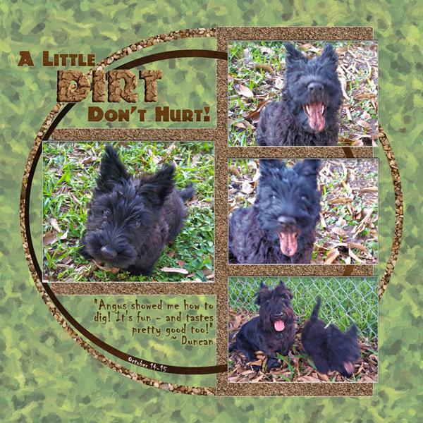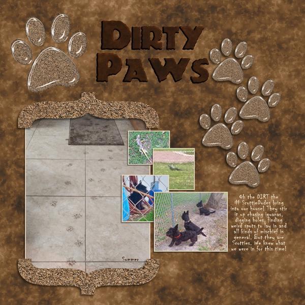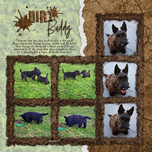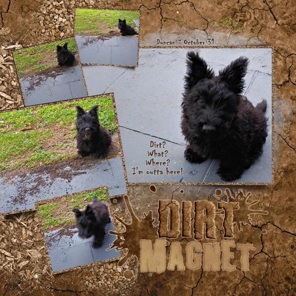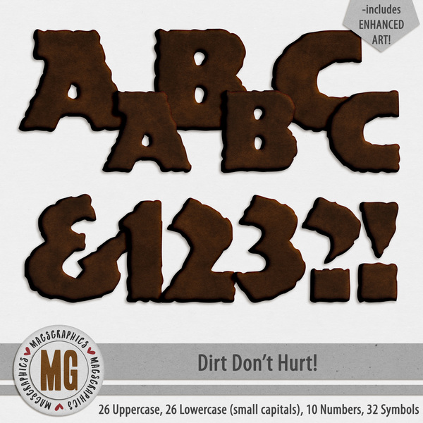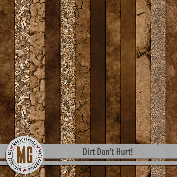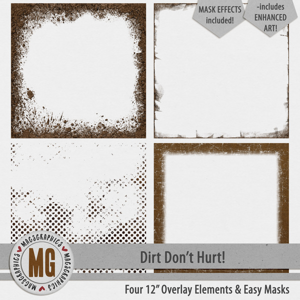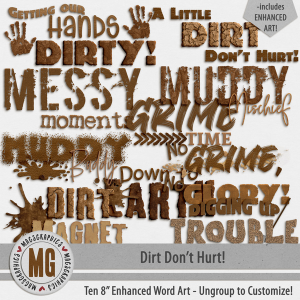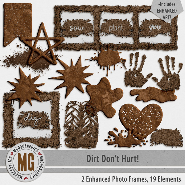 Dirt Don't Hurt - Sometimes you need some papers and elements to "dirty-up" your layout. Maybe you were caught in a rainstorm, had a dog in need of a bath, had kids that played in the mud, did a home renovation, or something else that required a few "DIRT" items. This Bundle was created to mix with any of your favorite kits and bring a bit of mud & dirt to your pages. It includes all of the following: 12 12"x12" Papers, 10 Enhanced Word Art, 2 Enhanced Frames, 19 Elements, 1 Alpha (26 Uppercase, 26 Lowercase/smaller Capitals, 10 Numbers, 32 Symbols), 4 Overlay Elements, and 4 Mask Effects. The shades of brown used coordinate with my Everyday Series. Need Water? Fire? Wood or Stone? Be sure to check out the Water, Water Everywhere sets, Hot Stuff Kit, Everyday Alpha Wood, Brick, or Stone.