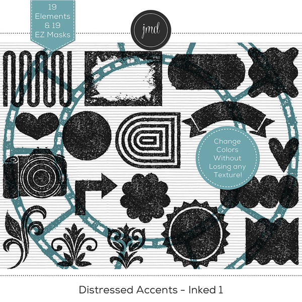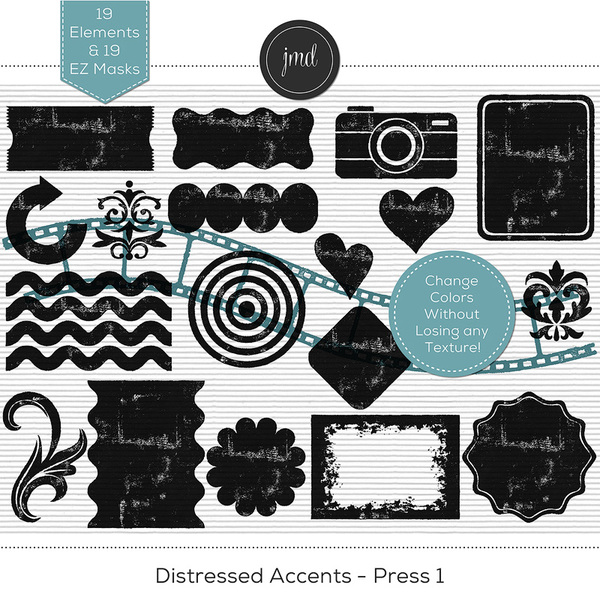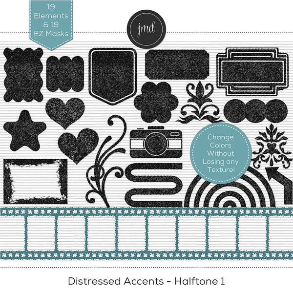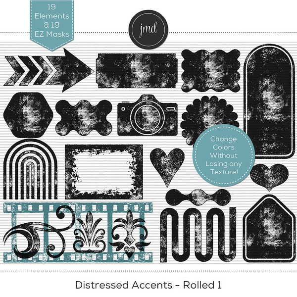 The Distressed Accents Bundle 1 offers a diverse selection of grungy, vintage-inspired embellishments and easy masks, available in Halftone, Inked, Press, and Rolled styles. With 76 elements and 76 masks, this bundle provides a wealth of design possibilities—from subtly weathered accents to bold, distressed textures. Easily recolorable without losing texture, these accents are perfect for adding artistic flair to your projects. Make sure to look for the coordinating Distressed Alpha Bundle 1. This bundle includes the following kits: Distressed Accents - Halftone 1, Distressed Accents - Inked 1, Distressed Accents - Press 1, and Distressed Accents - Rolled 1.