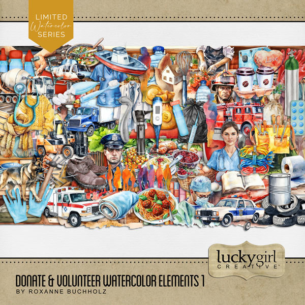 These digital scrapbooking watercolor embellishments, papers, clusters, alpha set, and word art are great for non-profit charities, giving, donating, medical, health, rescue heroes, and volunteering for various organizations and clubs. The Red Cross, Feeding America, Salvation Army, Habitat for Humanity, Operation Smile, United Way, Goodwill, Doctors without Borders, and First Responders are all represented in this collection. Embellishments include abandoned building, disaster, Bible, blankets, books, clothesline, charity, volunteer, cabinet, shelf, cardboard box, washer or dryer, cleaning supplies, clothes, scarf, shoes, sweater, construction tools, coffee, wheelbarrow, cables, cords, hammer, nails, work gloves, construction worker, dental tools, toothbrush, toothpaste, tooth, German Shepherd, rescue hero, emergency, medical, police, fireman, ambulance, rescue boat, firetruck, helicopter, police car, vehicle, electrical box, wildfire, eggs, food basket, canned food, meal prep, garden, food pantry, soup, spaghetti, Thanksgiving dinner, water bottle, chair, table, diverse hands, house, home, heater, dishes, soup ladle, whisk, bandage, blood, medical supplies, emergency kit, first aid kit, crutches, gloves, oxygen, pills, meds, stretcher, needle, medical tape, doctor coat, doctor, nurse, stethoscope, thermometer, money, cash, coin, credit card, paper bag, elderly couple, man, woman, people, family, heart, love, seeds, sleeping bag, tent, toilet paper, towel, trash bag, cement truck, delivery truck, delivery van, vehicle, forklift, tires, workers, and wooden crate. This bundle includes Donate & Volunteer Watercolor Elements 1, Donate & Volunteer Watercolor Clusters 1, Donate & Volunteer Watercolor Papers 1, Donate & Volunteer Word Art 1, and Denim Patch Alpha Set. Designer: Roxanne Buchholz, Lucky Girl Creative