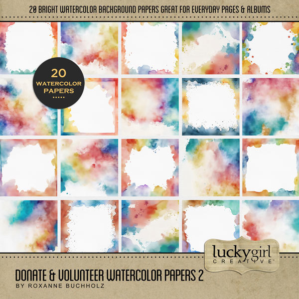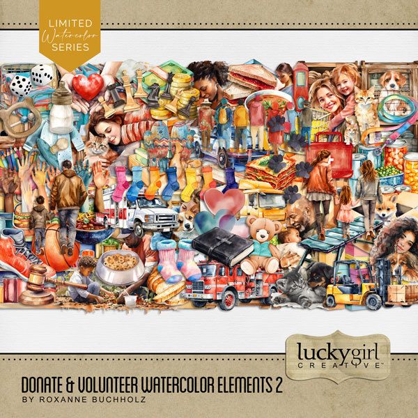 These digital scrapbooking watercolor embellishments, papers, alpha set, and word art are great for non-profit charities, giving, donating, after school programs, and volunteering for various organizations and clubs. Big Brothers and Big Sisters of America, UNICEF, St. Jude Children's Hospital, Boys & Girls Club of America, YMCA, Samaritan's Purse, Operation Christmas Child, Planned Parenthood, World Literacy Foundation, Humane Society, World Vision, and Women's Shelters are all represented in this collection. Embellishments include colored pencils, sneaker, basketball, board games, dice, backgammon, volunteer, chess, art journal, notebook, baby bottle, rattle, diaper, newborn clothes, pajamas, pacifier, pregnant mother, duffle bag, overnight bag, Bible, sand bag, binders, bottle of love, building, cabinet, shelf, sweater, cardboard box, charity, cleaning supplies, crate, hat, gloves, mittens, raincoat, emergency cot, stretcher, ambulance, firetruck, police car, vehicle, fire, bread, lunch, cafeteria tray, canned food, bowl of chili, grocery bags, lasagna, lunchbox, pantry shelf, sandwich, soup, gardening, kitty cat, puppy dog, fruit boxes, grocery shopping cart, thumbs up, hand up, heart in hands, hearts, love, legal, judge, gavel, courthouse, court, judge's robe, man and boy, woman and girl, children, kids, medical kit, thermometer, mask, hospital bed, money, cash, coins, paper bags, diversity, family, people, hands, pet carrier, leash, pet food bowl, paw prints, veterinarian, picnic table, shoebox, socks, towel, stuffed animal, plush toy, delivery truck, forklift, bus, crate, and more! This bundle includes Donate & Volunteer Elements 2, Donate & Volunteer Word Art 2, Donate & Volunteer Watercolor Clusters 2, Donate & Volunteer watercolor Papers 2, and Striped Fabric Teal Alpha Set. Designer: Roxanne Buchholz, Lucky Girl Creative
