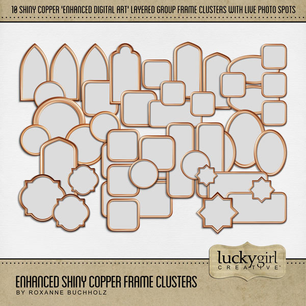 Celebrate special occasions with these beautiful Enhanced Digital Art gold, silver, copper, rose gold, and black frame clusters. Each layered group cluster includes multiple frames and live photo spots making your pages come together quickly and easily. Fully editable! To extend your frame shapes, be sure to look for the Enhanced Shiny Frames Bundle sold separately. This bundle includes the Enhanced Shiny Black Frame Clusters, Enhanced Shiny Copper Frame Clusters, Enhanced Shiny Gold Frame Clusters, Enhanced Shiny Rose Gold Frame Clusters, and Enhanced Shiny Silver Frame Clusters. Designer: Roxanne Buchholz, Lucky Girl Creative