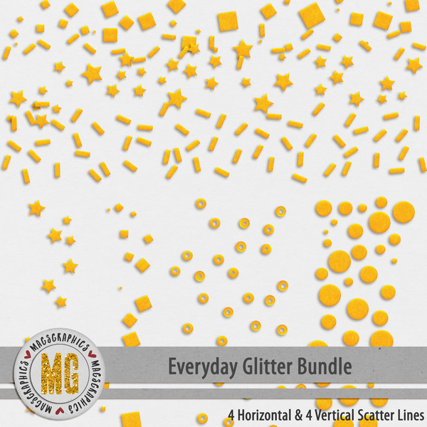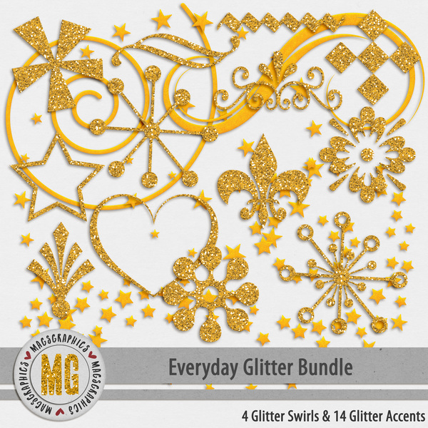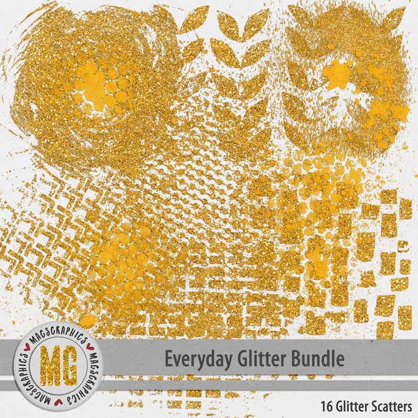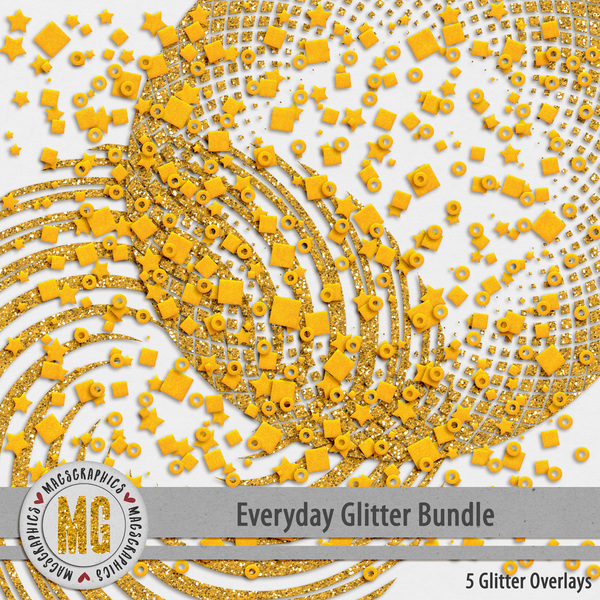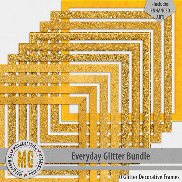 Everyday Glitter Bundle - The Everyday series is full of trusty, versatile items that can be used with any of your favorite kits. This is a big bundle of GLITTER! Bling out all of your layouts with the items in this EVERYDAY GLITTER BUNDLE. It includes 20 12"x12" Papers, 54 Embellishments, and 20 Enhanced Decorative Frames (access through effects or the right-hand frames panel). You can recolor the papers and elements through the hue & saturation options. Mix & match this Bundle with any of your favorite kits!