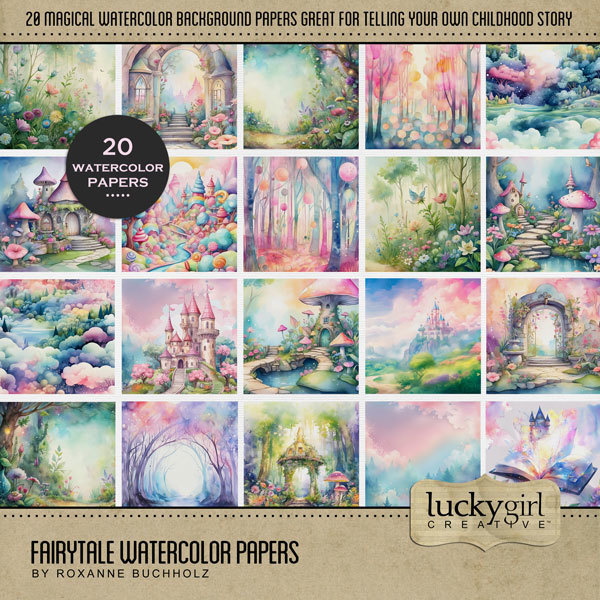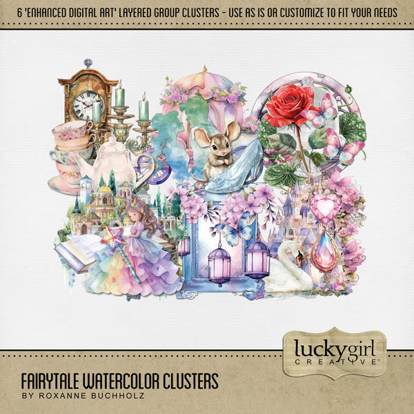 Capture the fairytale moments of childhood with this beautiful, watercolor bundle filled with fantasy embellishments, clusters, papers, and golden alpha set designed for a princess! Fairy tale embellishments include bluebird, chickadee, bird, butterfly, dragon, elk, goose, horse, mouse, sheep, swan, unicorn, beanstalk, pea, canopy bed, book, candelabra, candle, carriage, castle, tower, chandelier, grandfather clock, crown, tiara, crown, veil, dragon egg, golden egg, enchanted chair, garden, door, vines, enchanted forest, envelope, feather, rose, flower, apple, crystal, gem, heart, glass dome, sparkles, rainbow, hanging lights, hot air balloon, jewelry, pendant, jewelry box, ring, key, magic lamp, lantern, magic beans, magic potion, magic wand, mirror, money, coin, moon, pearls, pillow, prince, princess, shield, knight, pumpkin, vine, dress, gown, bow, ribbon, shoe, high heel, silhouette, stained glass window, teacup, teapot, window, wizard, staff, wand, basket, broom, and bucket. The bundle contains Fairytale Alpha Set, Fairytale Watercolor Clusters, Fairytale Watercolor Elements, Fairytale Watercolor Frames, and Fairytale Watercolor Papers. Designer: Roxanne Buchholz, Lucky Girl Creative
