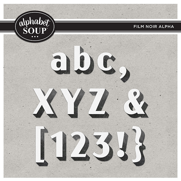 Add the perfect title or word art to your page with alphas by Alphabet Soup. This purchase is for the Film Noir Alpha. It includes a-z, A-Z, 0-9 and punctuation.